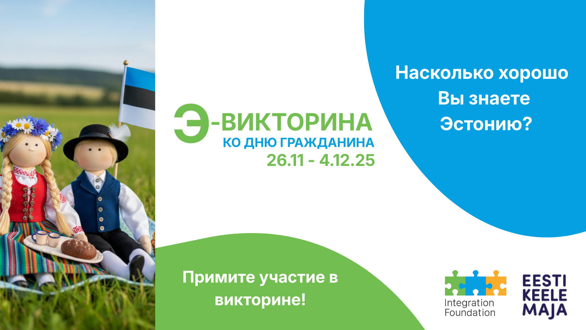 По случаю Дня гражданина, который отмечается 26 ноября, Фонд интеграции приглашает всех желающих проверить свои знания об Эстонии в тематической онлайн-викторине. Пройти викторину можно до 4 декабря. Викторина состоит из 30 вопросов.